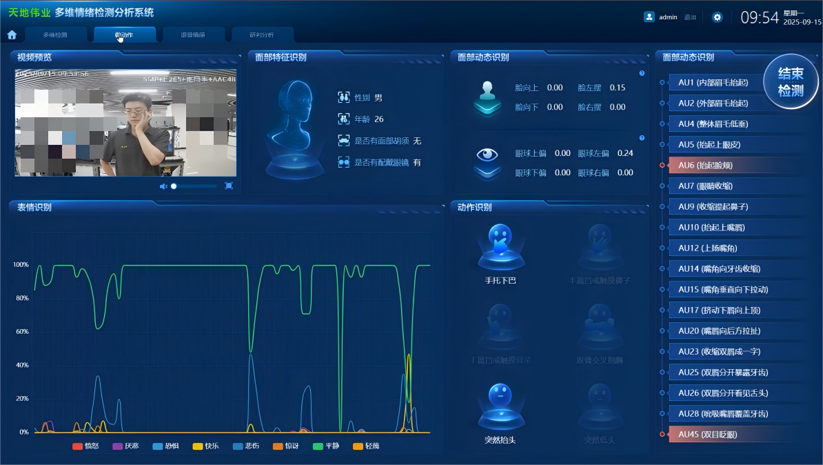 细微的肢体动作往往是心理状态的“晴雨表”,但传统监测难以捕捉。系统通过AI算法精准识别32种微动,包括:头部运动(向上、向下、左摆、右摆)、眼部运动(眼球左/右/上/下偏),典型动作(手遮挡/触摸鼻子/耳朵、双臂交叉抱胸、突然抬头/低头、手托下巴),18种AU面部动作单元(如内部眉毛抬起、上眼皮抬起、嘴角上扬、嘴唇收缩等)。