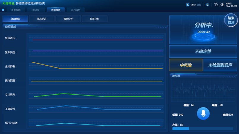 例如在谈话场景中,系统可通过声纹判断对象是否“疑似谎言”(如语调突然升高、语速变慢)、是否“主动抑制”情绪(如声音低沉、停顿频繁),或是否处于“低压力陈述”状态(语调平稳、语速均匀)。搭配天地自研的360°悄悄话阵列拾音器8麦角色分离麦克,可确保音频采集清晰无干扰,进一步提升声音情绪分析的准确性。